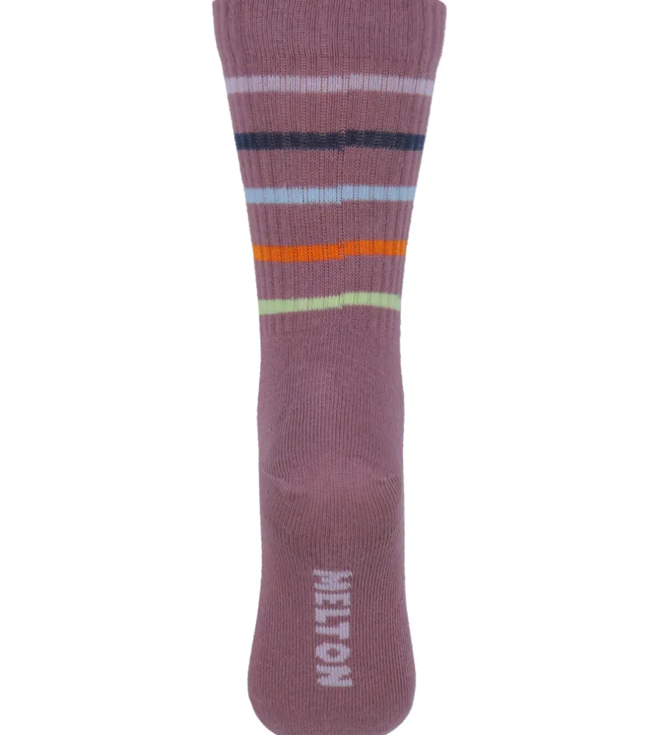 Stilfulde Melton strømper i en flot lilla farve med vandrette, farverige striber. Strømperne har et almindeligt længde skaft med en smal ribkant øverst, der sikrer en god pasform. Melton står for kvalitet og enkelhed.