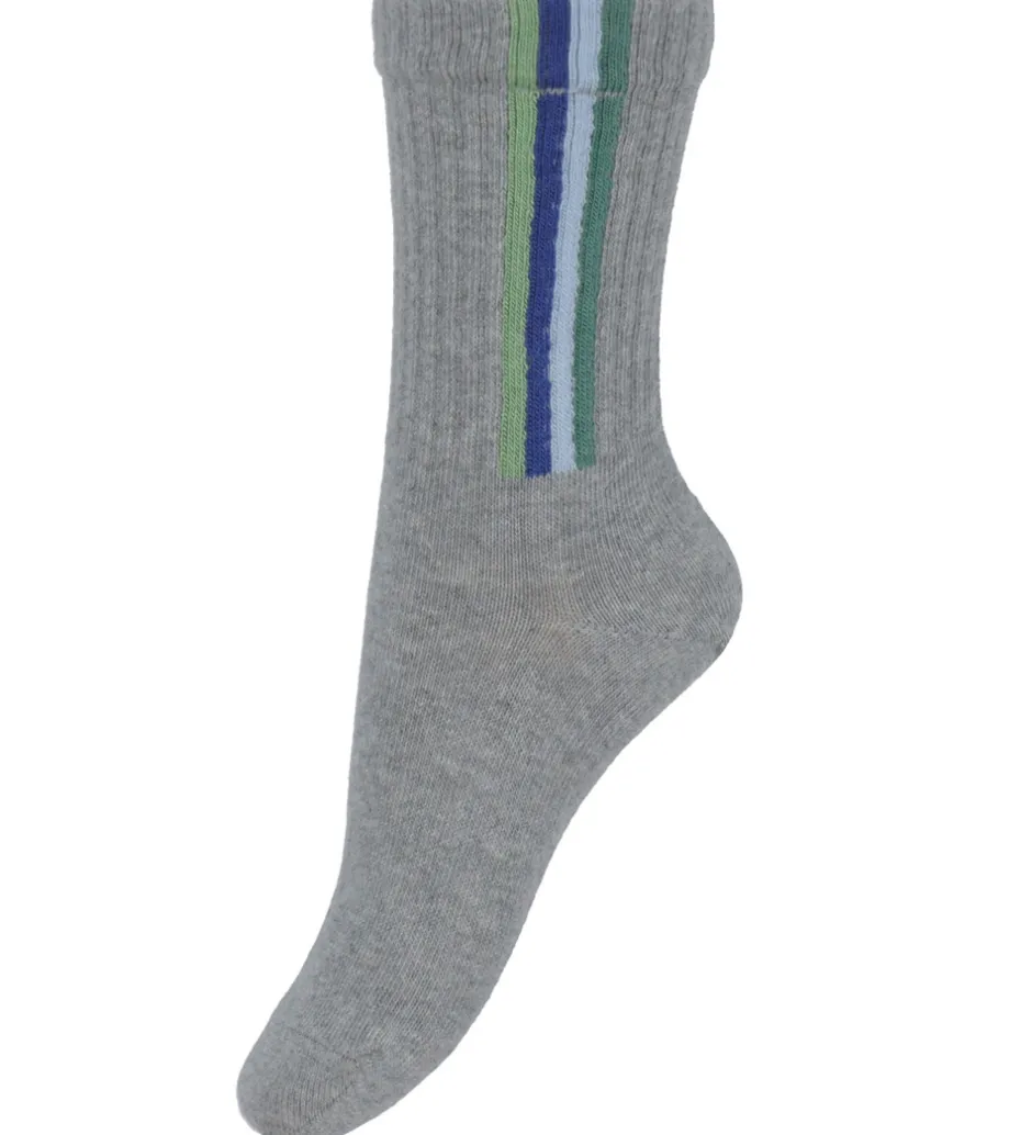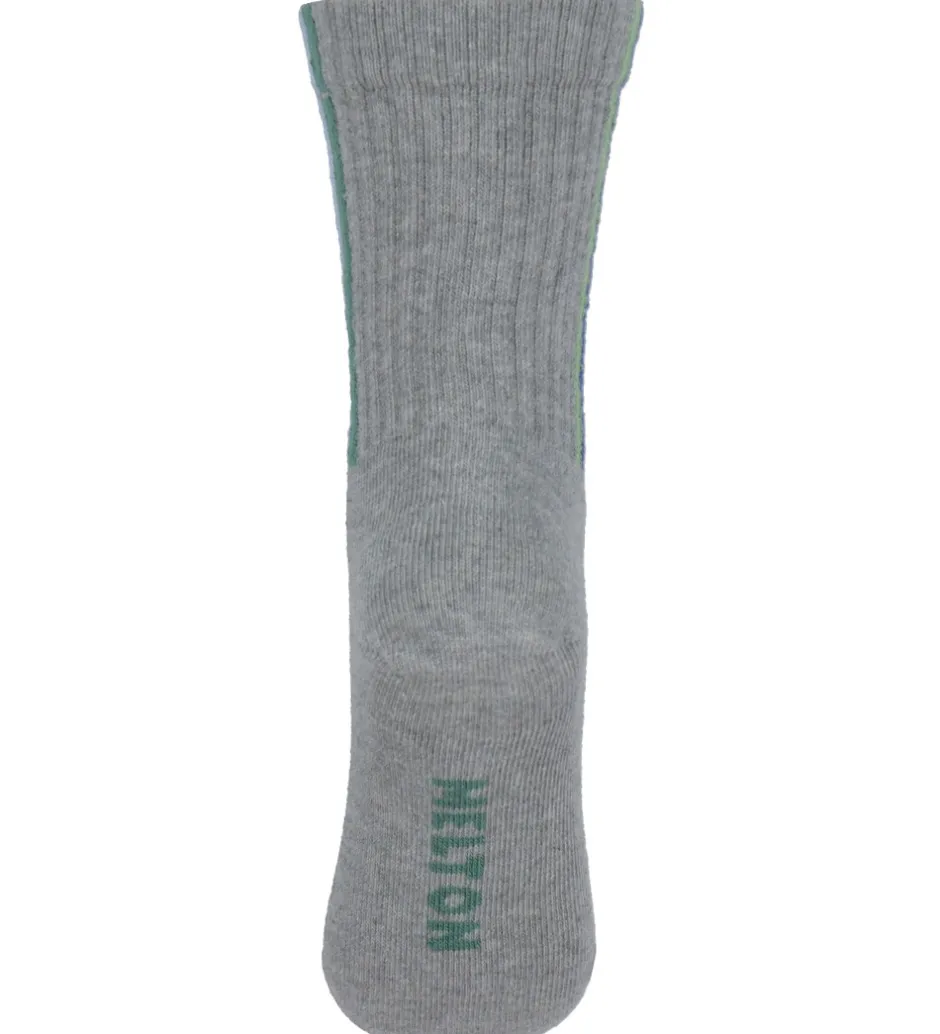 Stilfulde Melton strømper i grå med lodrette striber i grønne og blå nuancer ned ad siderne på skaftet. Strømperne har en ribstrikket struktur og en elastisk ribkant øverst, som sikrer en god pasform. Melton strømperne tilbyder en klassisk og tidløs stil.