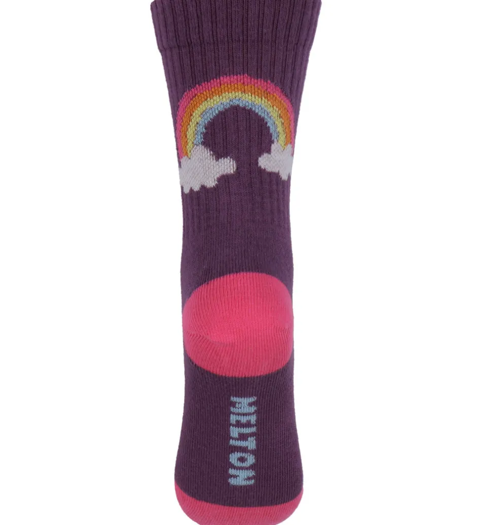 Charmerende Melton strømper med en base i mørk lilla og detaljer i pink ved tå og hæl. bag på skaftet er der en farverig regnbue med en sky. Strømperne har en ribkant øverst, som sikrer en god pasform.