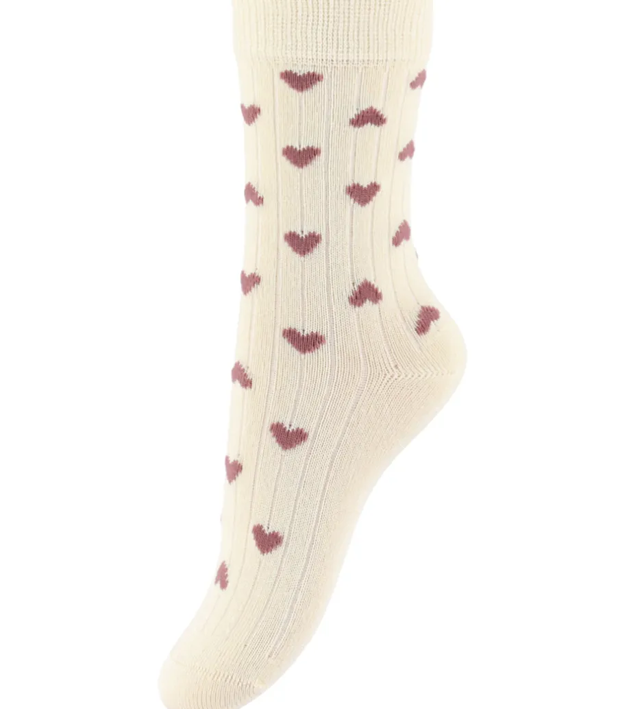 Attraktive MiniPop strømper i en 3-pak med forskellige mønstre. Et par er råhvide med blomster, et er mørk rosa med leopardmønster, og et tredje er råhvide med små hjerter. Strømperne har et langt skaft med en robust ribkant øverst for god pasform.