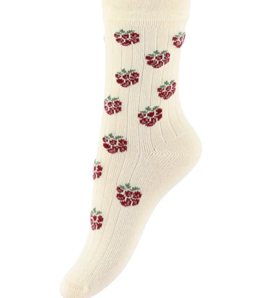 Flotte MiniPop strømper i en 3-pak med forskellige designs. Et par har et farverigt stribet mønster, det andet par er fuchsia med tynde striber og et lille hjerte, og det tredje par er cremefarvet med bærprint. MiniPop strømperne har elastik øverst, som sikrer god pasform.
