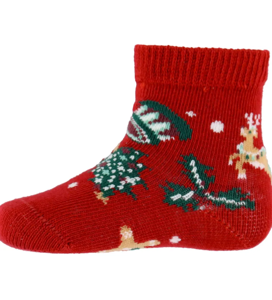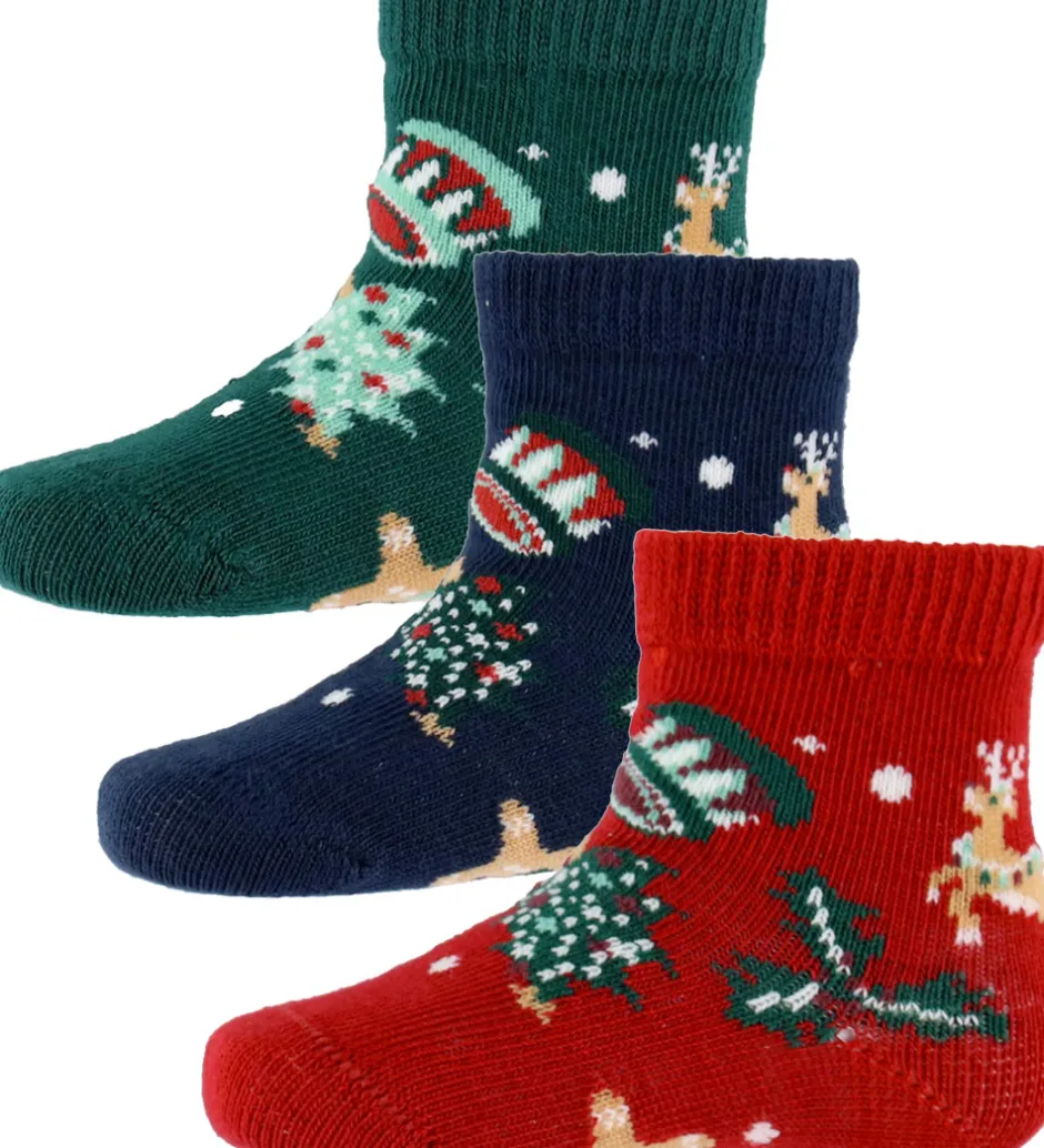 Charmerende Name It strømper solgt i en 3-pak i grøn, blå og rød med julemotiver, herunder juletræer og rensdyr. Strømperne har et skaft med ribkant øverst, hvilket sikrer en god pasform.