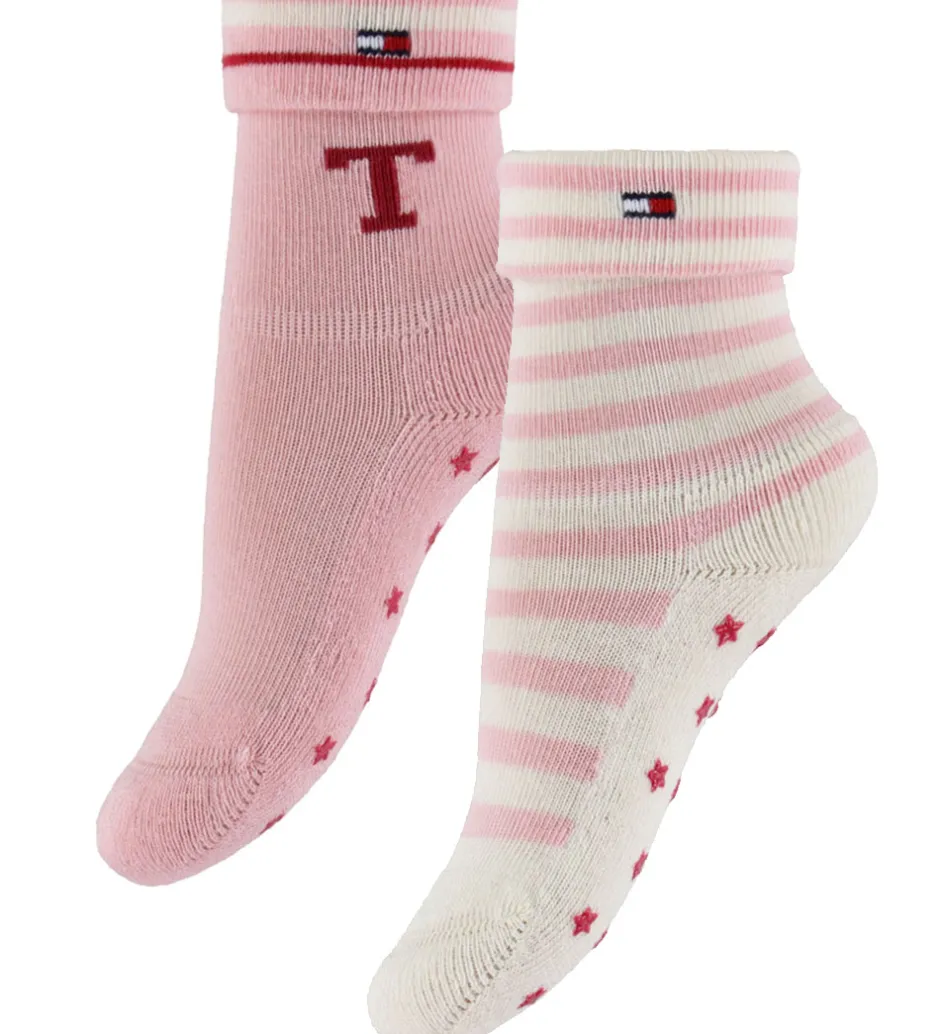 Charmerende Tommy Hilfiger strømper i en 2-pak med forskellige design. Et par er lyserøde med et enkelt “T” på siden, mens det andet par er stribet i hvid og lyserød. Tommy Hilfiger strømperne har en ribkant øverst for en god pasform. Strømperne har stjerneformede silikonedutter under fødderne, som giver et godt fodfæste.