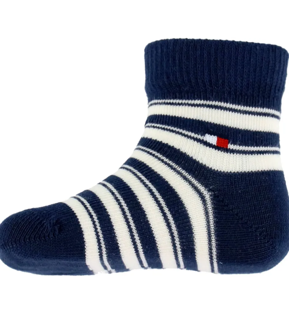 Stilrene Tommy Hilfiger strømper sælges i en 3-pak med både navy og hvide par. Et par er navy med et hvidt “TH” logo, mens de to andre er hvide med navy striber og det ikoniske Tommy Hilfiger logo. Strømperne har en bred elastikkant for en god pasform.