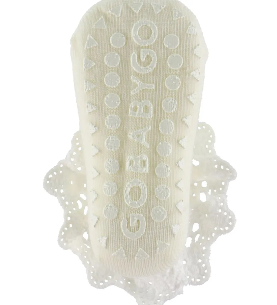 Søde GoBabyGo skridsikre strømper i ensfarvet hvid med en flot blondeflæse rundt om skaftet.