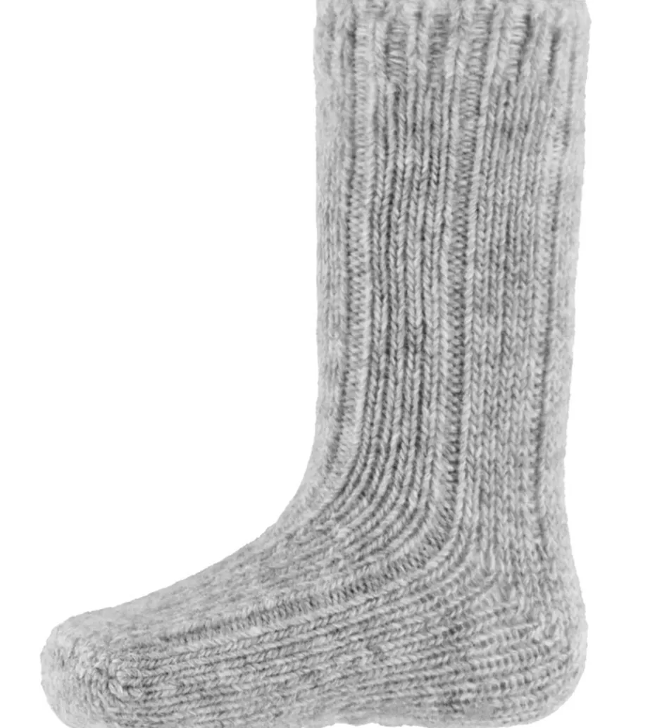 Lækre MiniPop gåstrømper i meleret grå. MiniPop gåstrømperne er lavet i en strikket kvalitet i en blød uldblanding af merinould, og under fødderne er der ssmå silikonedutter, som sikrer et godt fodfæste.