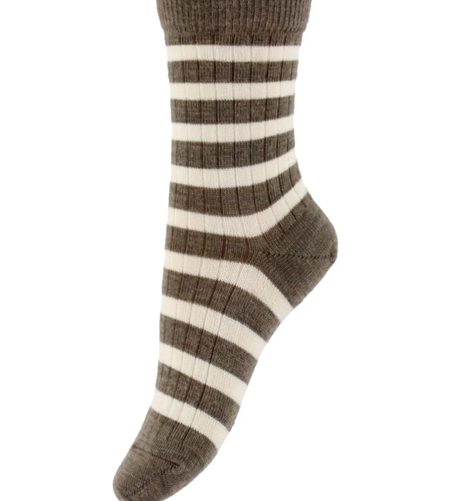 Stilrene MP strømper med brune og hvide vandrette striber. MP strømperne har en blød ribstruktur og en elastisk kant øverst, der sikrer en god pasform.