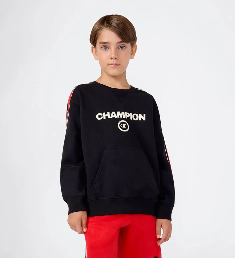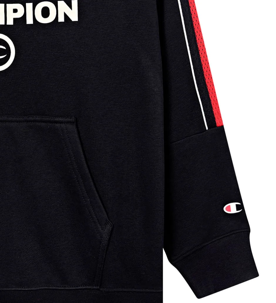 Flot Champion sweatshirt i sort med et hvidt logo på brystet og mesh-paneler i sort og rød langs ærmerne. Champion sweatshirten har lange ærmer og ribkanter ved alle åbninger. Fortil er der en rummelig kængurulomme. Indvendigt er der blødt, børstet bomuld.