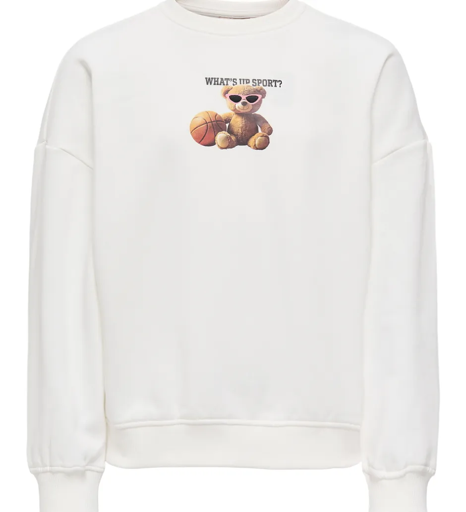 Smart Kids Only sweatshirt i hvid med et humoristisk print af en teddybjørn iført solbriller med teksten “What’s Up Sport?” på fronten. på ryggen er der et stort, sort print med teksten San Francisco 31 California Dreaming”. Kids Only sweatshirten har lange ærmer og rund halsudskæring, hvilket giver et enkelt og tidløst udtryk. Indvendigt er der blødt, børstet bomuld.