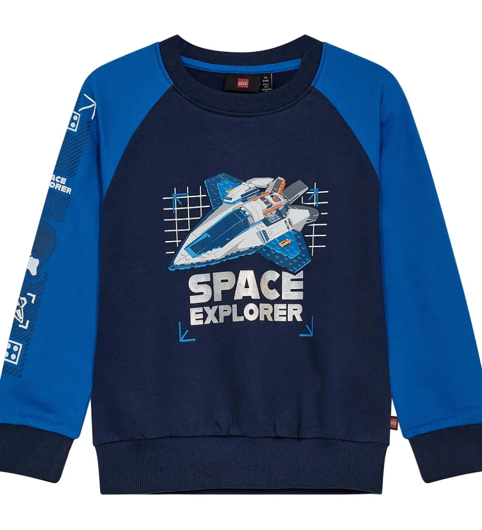 Skøn LEGO® Wear city sweatshirt i blå farver og med et iøjnefaldende Space Explorer-print fortil hvor teksten er i sølv. Sweatshirten er med blød, børstet bomuld indvendigt.