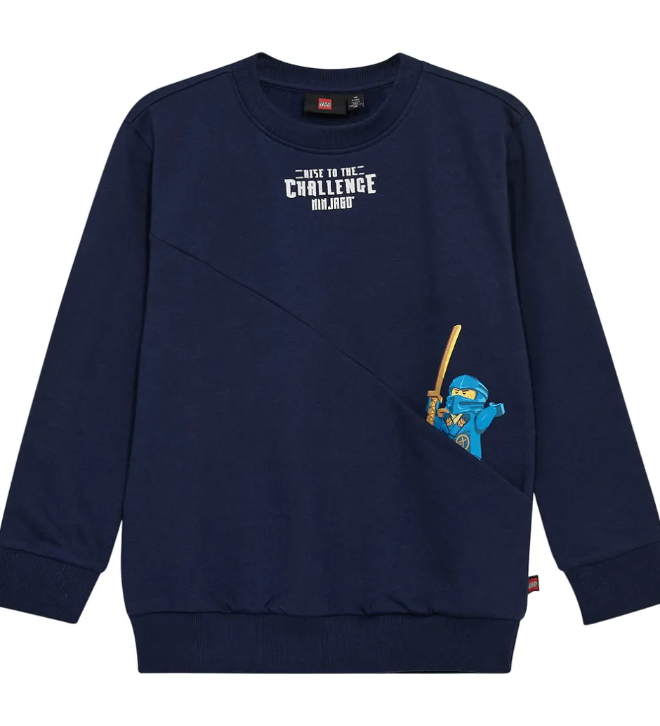 Smart LEGO® Wear Ninjago sweatshirt i mørkeblå med et hvidt tekstprint øverst samt print af en LEGO® Ninjago-figur. Sweatshirten har en diagonal syning som danner en åben lomme i den ene side, under figuren. Sweatshirten er med blød, børstet bomuld indvendigt.
