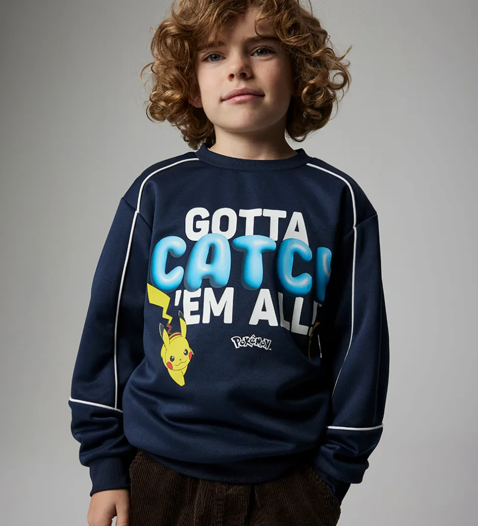 Smart Name It bluse i petroleumsblå med et stort print på fronten af Pikachu og teksten “Gotta Catch ‘Em All”. Blusen har facon som en sweatshirt med ribkanter ved åbningerne. Blusen har hvide konstraststriber ved ærmerne, og den er fremstillet af polyester.