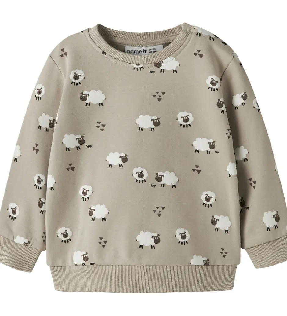 Smart Name It sweatshirt i beige med et alloverprint af får. Name It sweatshirten har lange ærmer og en rund halsudskæring med trykknapper ved venstre skulder. Indvendigt er der blødt, børstet bomuld.
