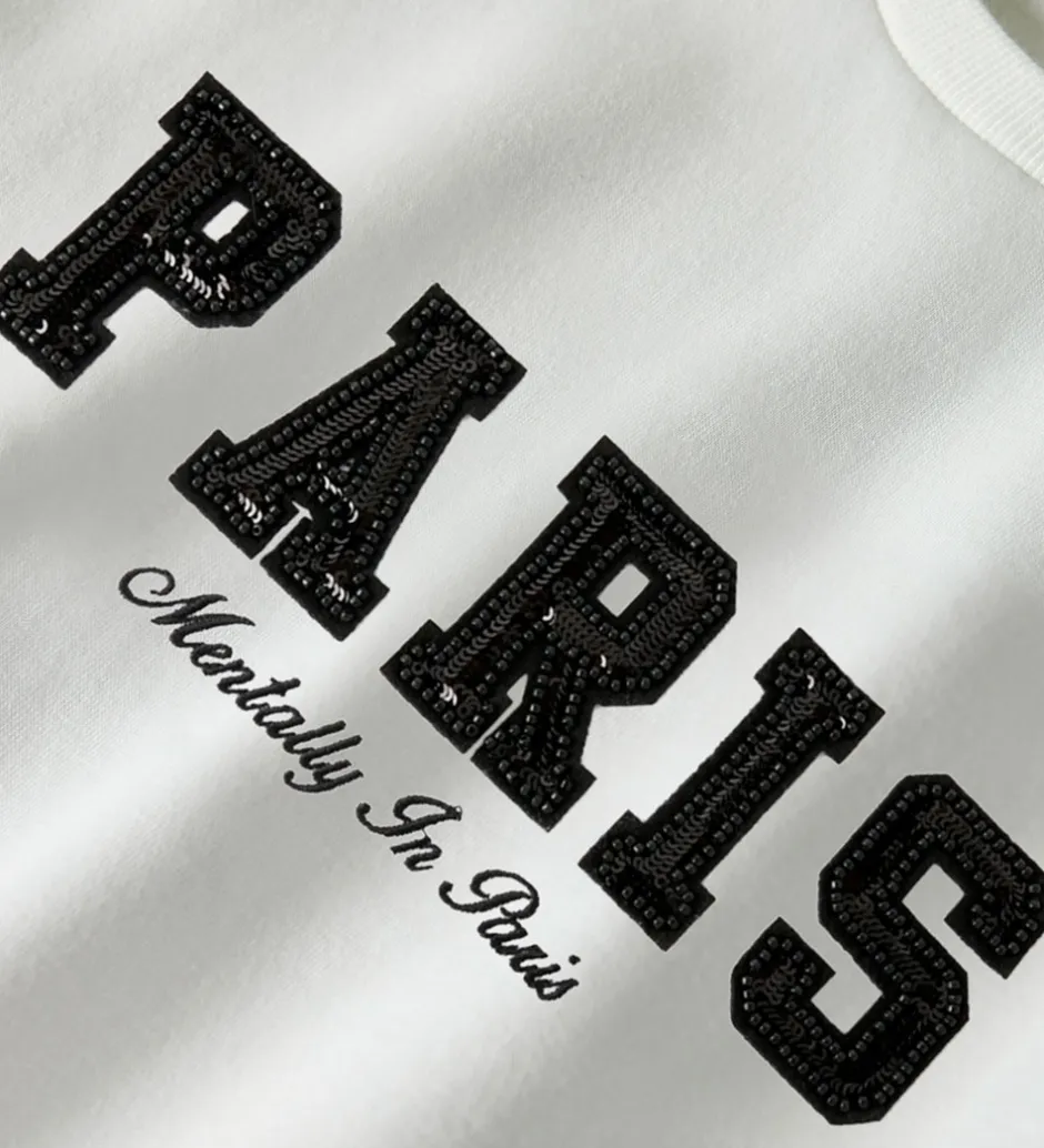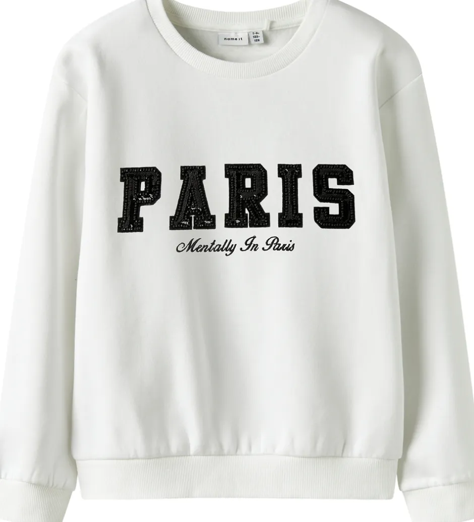 Stilfuld Name It sweatshirt i hvid med teksten “Paris” i sorte palietter og perler og “Mentally In Paris” broderet i sort nedenunder. Name It sweatshirten har lange ærmer og rund hals. Indvendigt er der blødt, børstet bomuld.