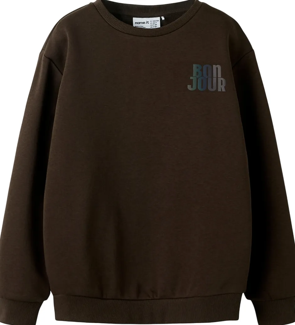 Stilfuld Name It sweatshirt i mørkebrun med teksten “Bonjour” med holografisk effekt på venstre bryst samt på ryggen. Sweatshirten har en rund halsudskæring med en smal ribkant og lange ærmer med brede ribkanter i ærme- og taljeåbning. Indvendigt er der blødt, børstet bomuld.