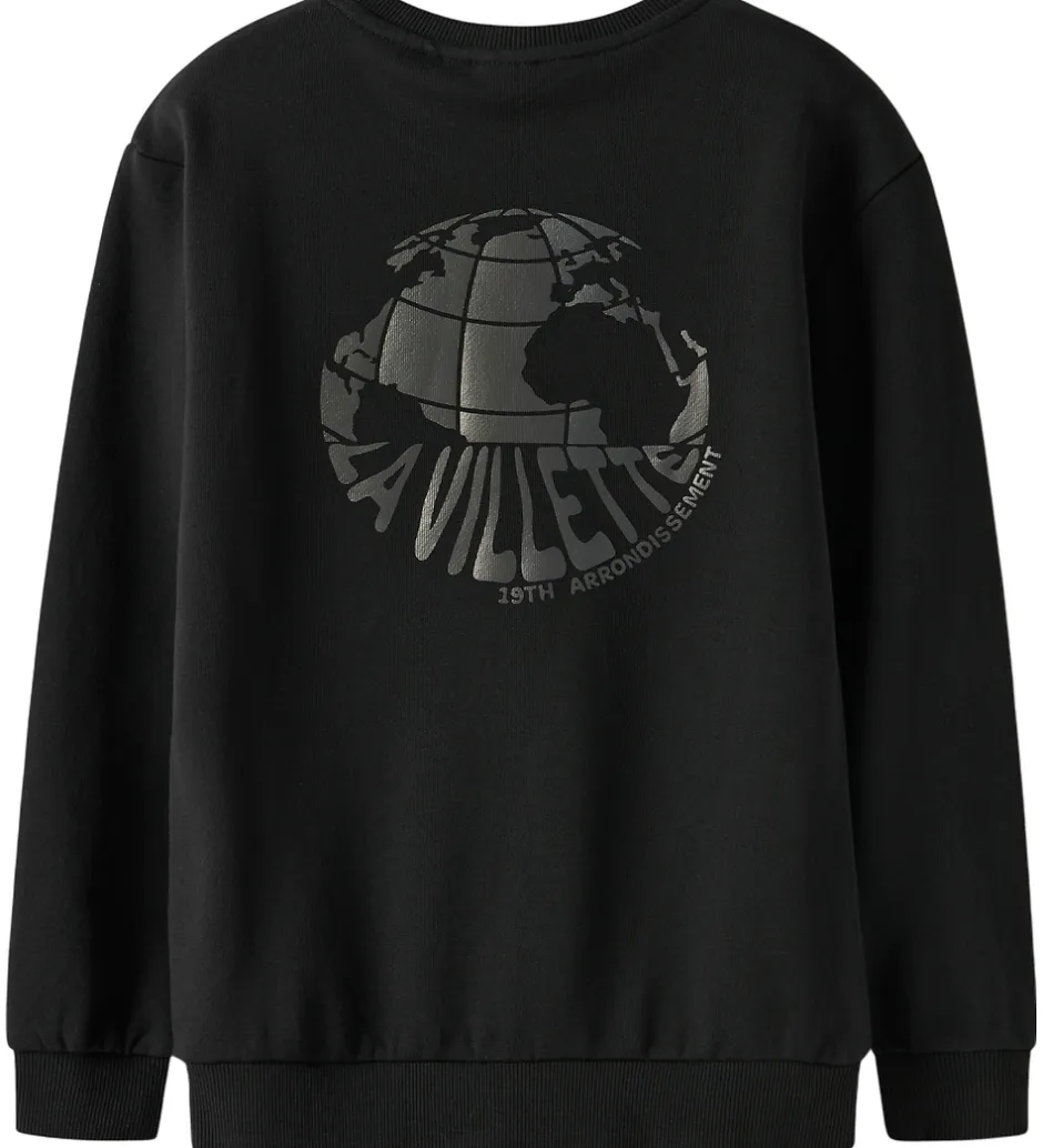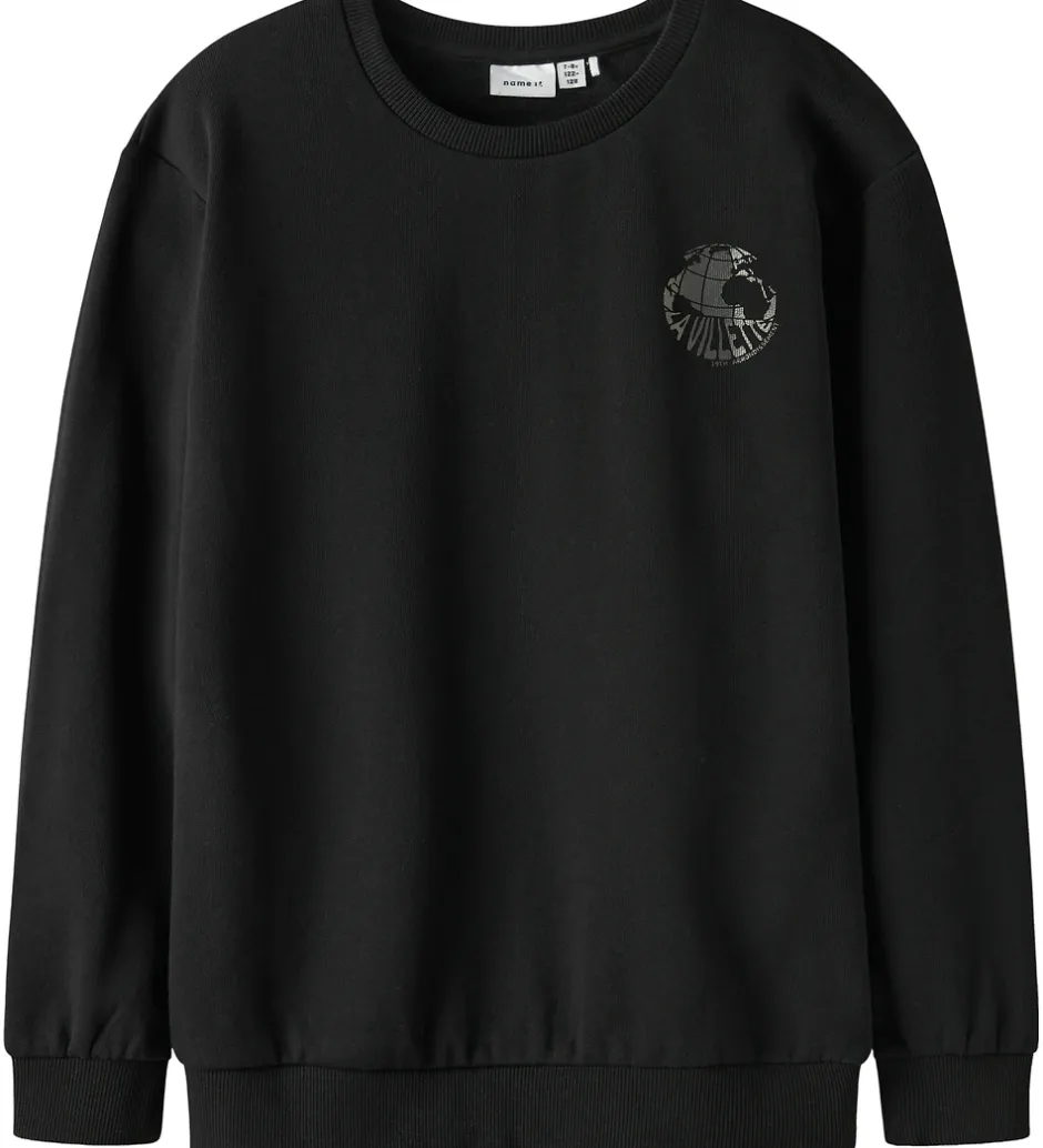 Smart Name It sweatshirt i sort med teksten globusprint på venstre bryst samt på ryggen. Sweatshirten har en rund halsudskæring med en smal ribkant og lange ærmer med brede ribkanter i ærme- og taljeåbning. Indvendigt er der blødt, børstet bomuld.
