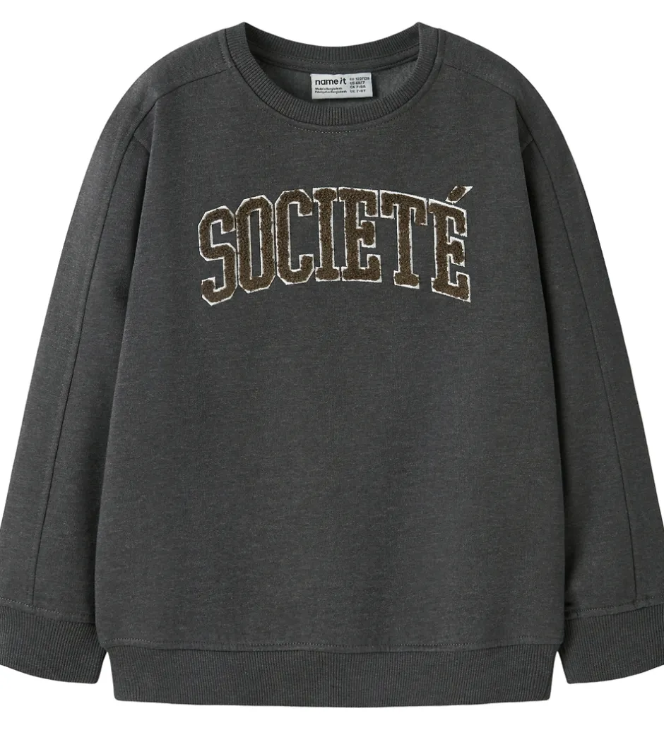 Stilfuld Name It sweatshirt i meleret mørkegrå med teksten “Societé” i brunt bouclé med hvid baggrund. Name It sweatshirten er designet med lange ærmer og en rund halsudskæring, der giver et klassisk udtryk. Ribkanter ved ærmerne og nederst sikrer en behagelig pasform. Indvendigt er der blødt, børstet bomuld.