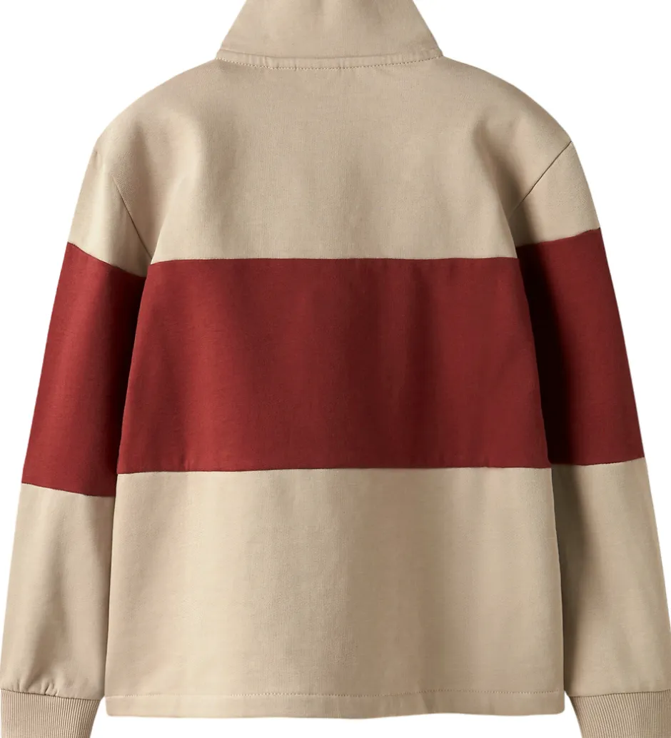 Sporty Name It sweatshirt i beige med en bred, rød stribe på midten med teksten “Embrace Le Voyage” broderet i orange. Name It sweatshirten har en mellemhøj krave med en kort lynlås fortil. Den har lange ærmer med brede ribkanter i ærmeåbningerne. Indvendigt er der blødt, børstet bomuld.