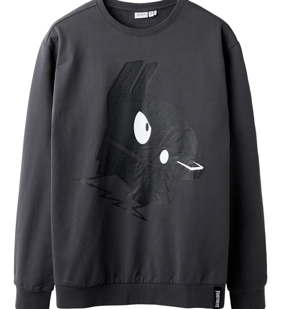 Sej Name It sweatshirt i mørkegrå med et stort print af en karakter fra Fortnite på forsiden. Name It sweatshirten har en rund halsudskæring og lange ærmer med ribkanter. Indvendigt er der blødt, børstet bomuld.