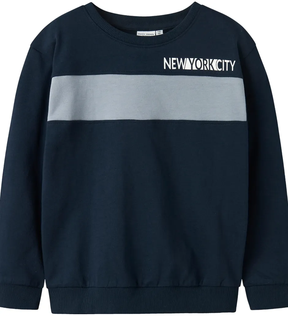 Stilren Name It sweatshirt i navy med en grå horisontal stribe på brystet. På højre bryst ses teksten “NEW YORK CITY” i hvide bogstaver. Sweatshirten har en rund halsudskæring og ribkanter ved ærmer og bund, og på indersiden er der børstet bomuld.