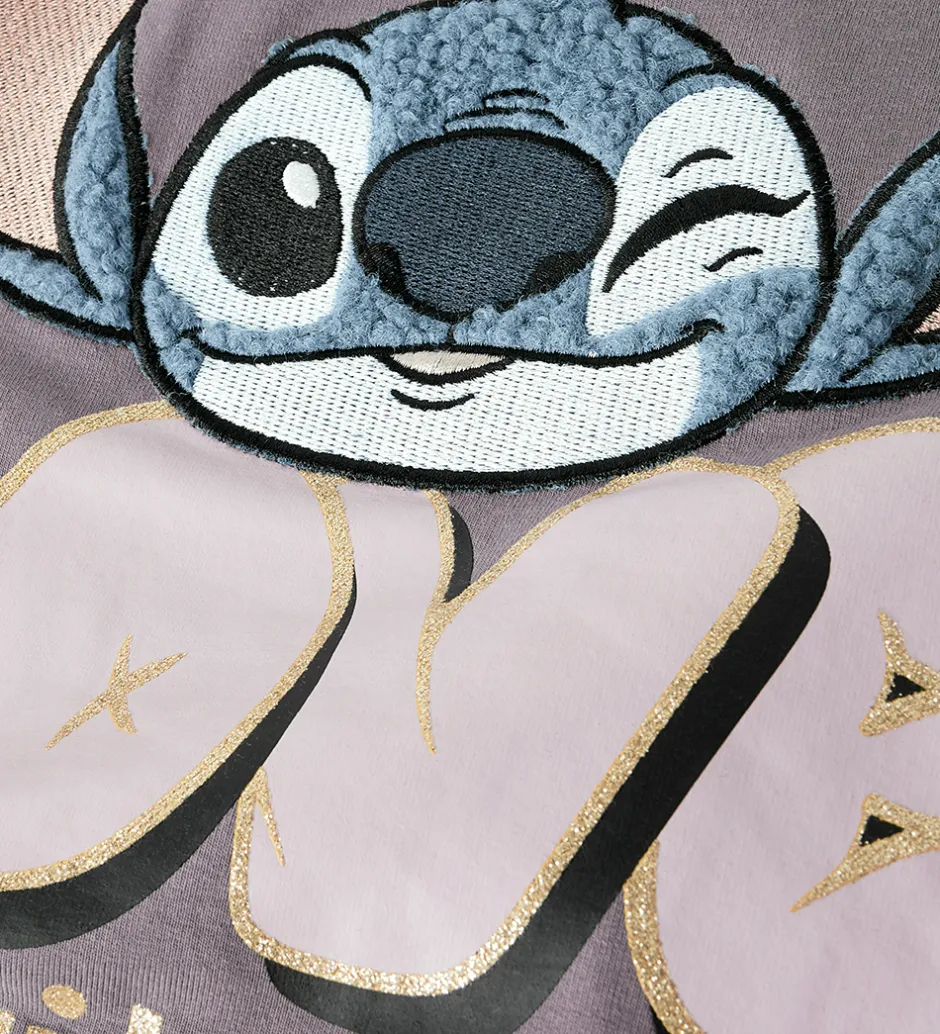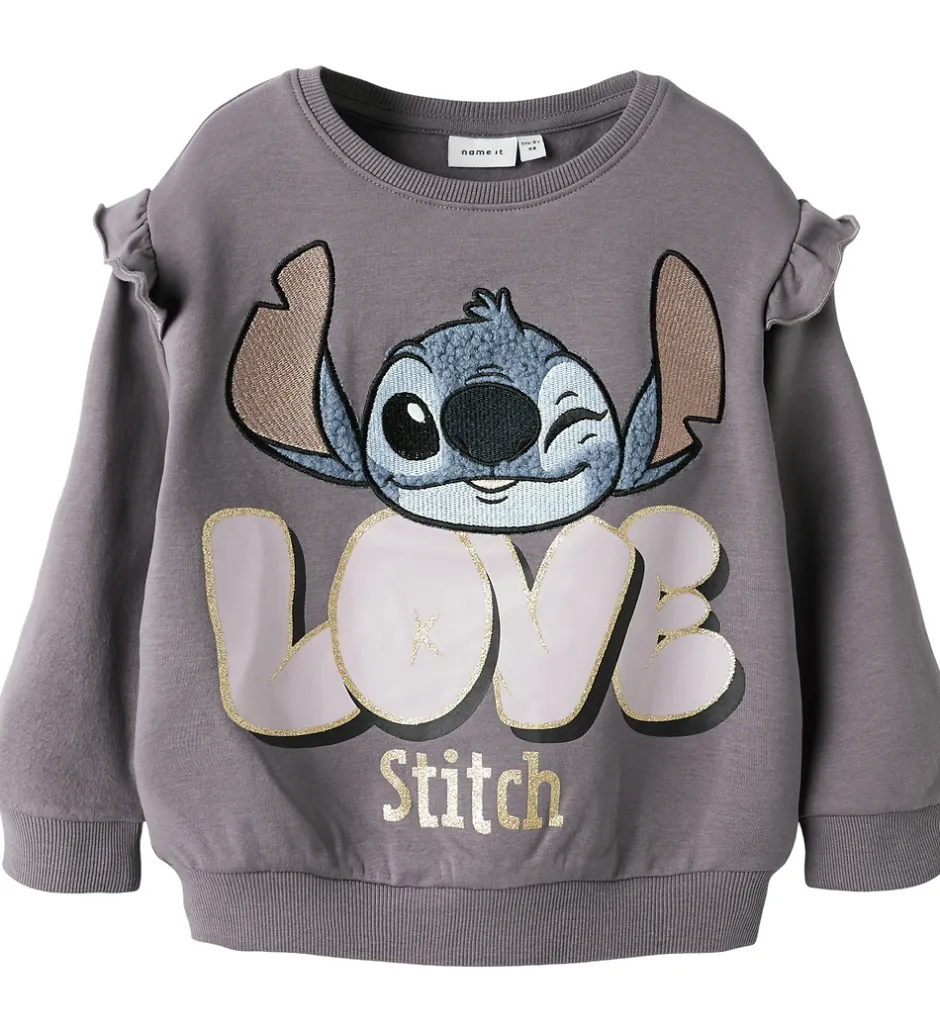 Charmerende Name It sweatshirt i lilla med print af Stith og teksten “Love Stitch” med detaljer i frotté og guld glimmer. Name It sweatshirten har en rund halsudskæring og lange ærmer med flæser ved skuldrene. Indvendigt er der blødt, børstet bomuld.