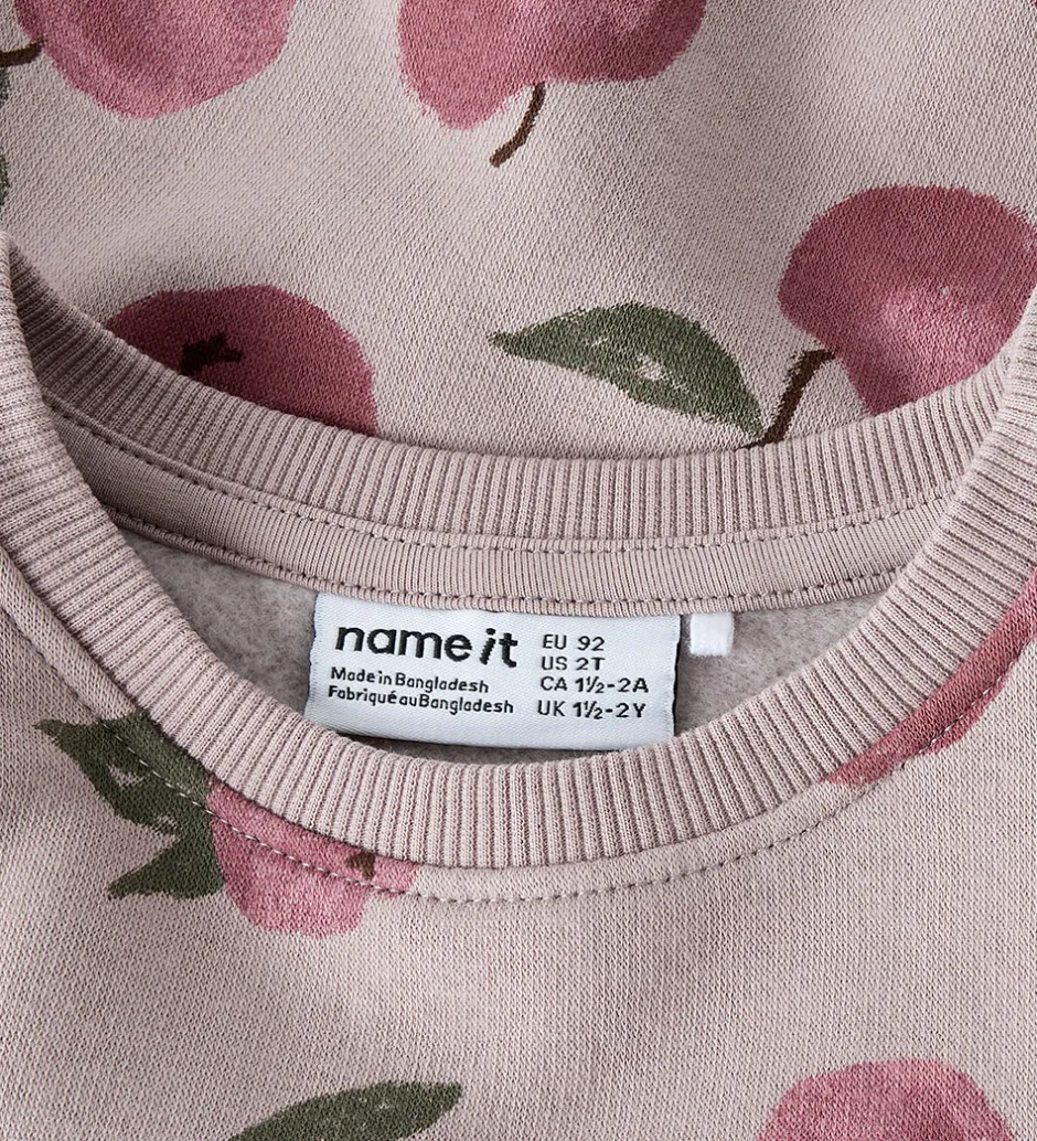 Fin Name It sweatshirt i støvet lyselilla med et alloverprint af frugter i rosa og grønne nuancer. Name It sweatshirten har en klassisk rund halsudskæring og lange ærmer med ribkanter. Indvendigt er der blødt, børstet bomuld.