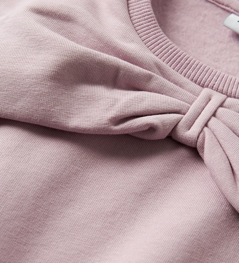 Flot Name It sweatshirt i rosa med en stor sløjfe foran. Sweatshirten har lange ærmer og ribkanter ved alle åbninger. Indvendigt er der blødt, børstet bomuld.