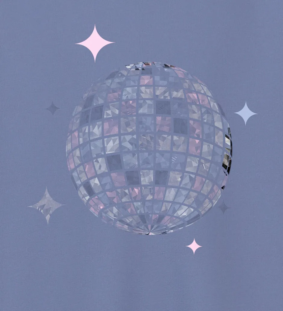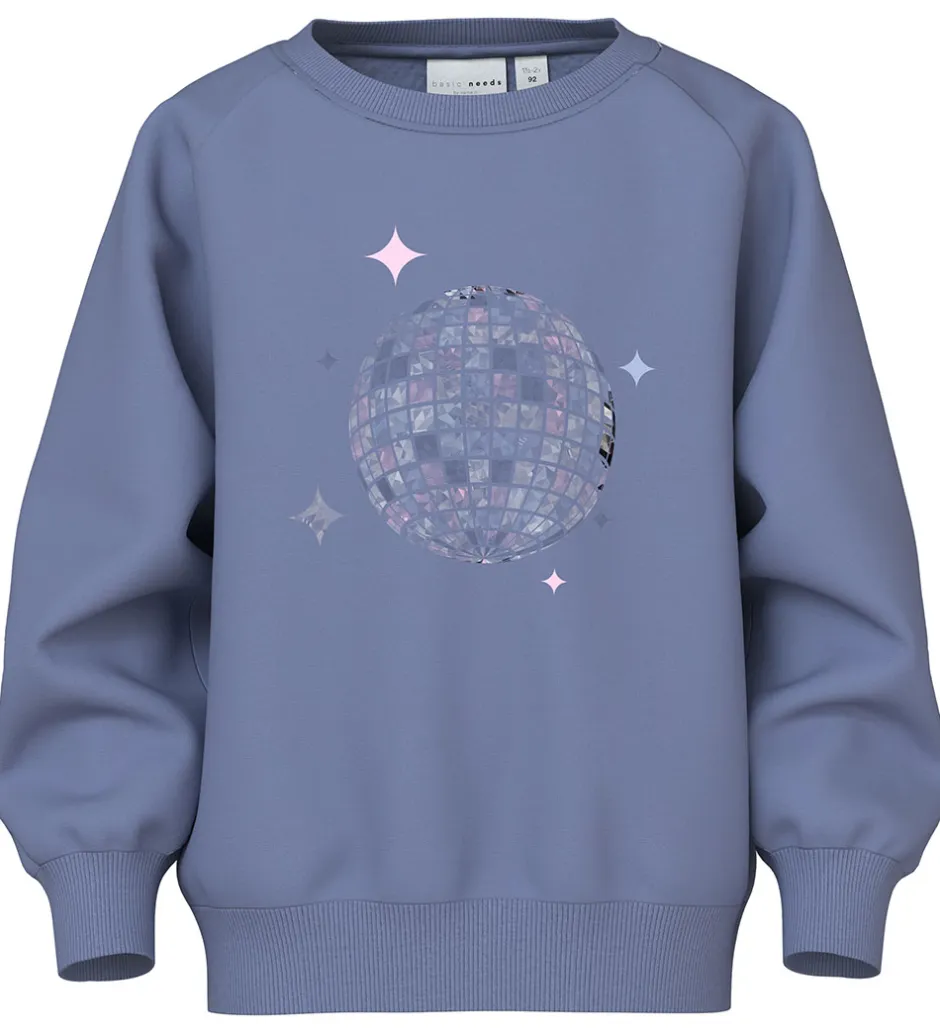 Stilfuld Name It sweatshirt i en afdæmpet lilla farve med et print på fronten af en farverig diskokugle. Name It sweatshirten har lange ærmer og ribkanter i alle åbninger. Indvendigt er der blødt, børstet bomuld.