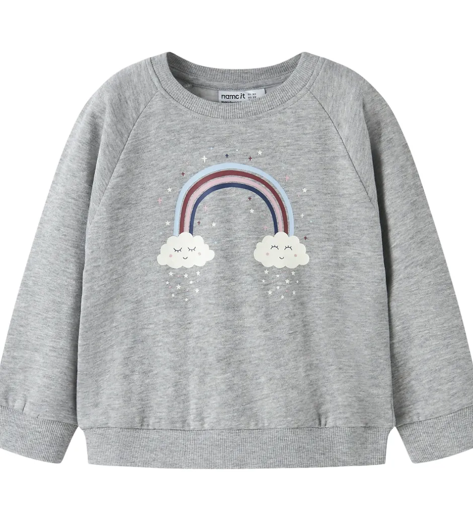 Charmerende Name It sweatshirt i en meleret, lysegrå farve dekoreret med et tryk af en regnbue mellem to skyer. Name It sweatshirten har lange ærmer og en rund hals, der tilføjer et enkelt udtryk. Ribkanter ved ærmer og bund fuldender designet.