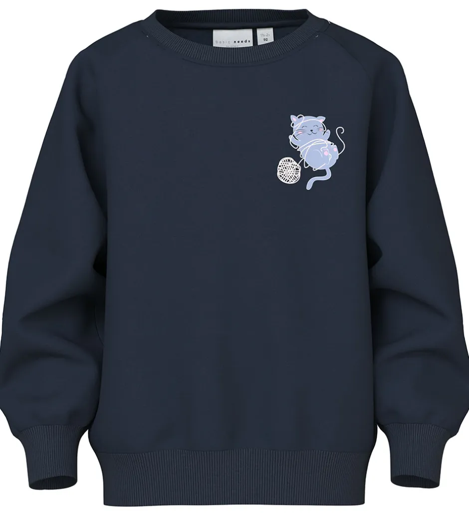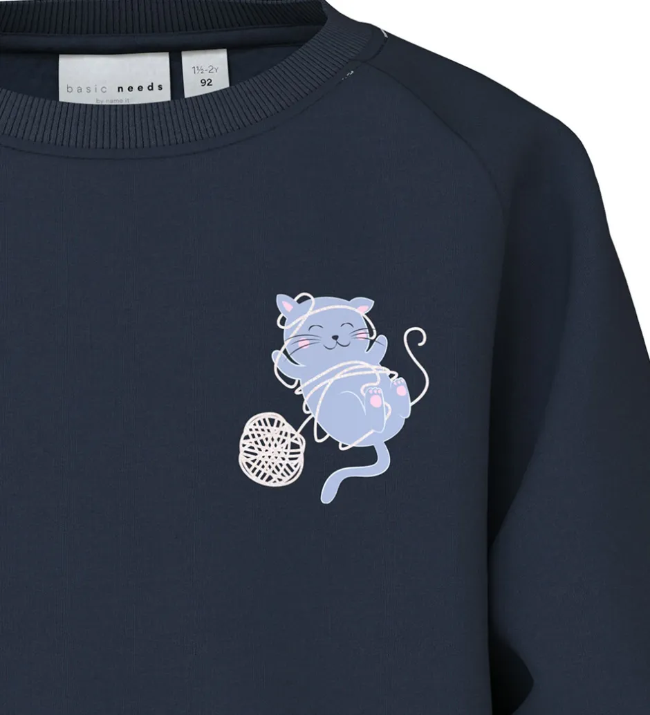 Sød Name It sweatshirt i navyblå med et sødt print på venstre bryst af en kat, der leger med en garnnøgle. Sweatshirten har lange ærmer og en rund halsudskæring med ribkanter ved alle åbninger. Indvendigt er der blødt, børstet bomuld.