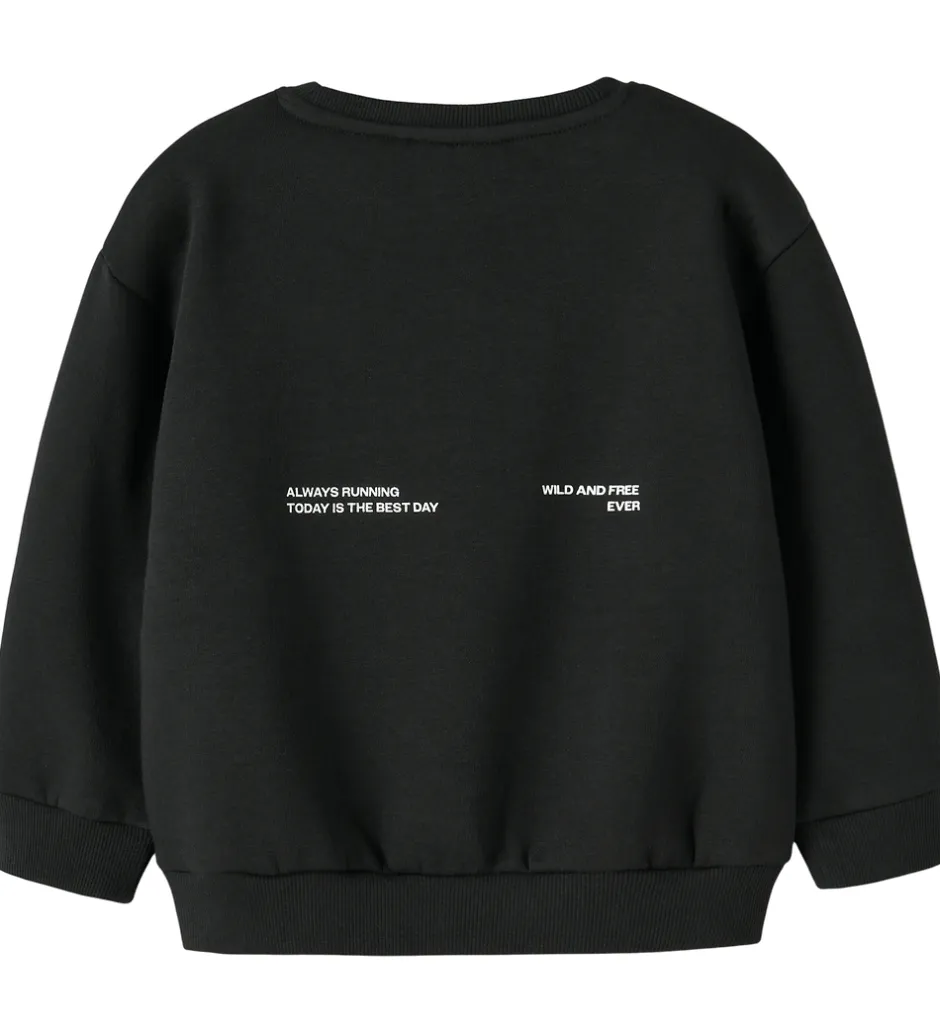 Stilren Name It sweatshirt i sort med teksten “Everyday Essentials” i hvid på venstre bryst. På ryggen er der hvidt tekstprint i siderne. Name It sweatshirten har lange ærmer, rund hals og ribkanter, som tilføjer et moderne og enkelt udtryk. Indvendigt er der blødt, børstet bomuld.