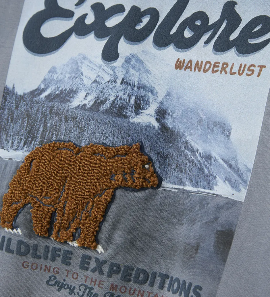 Skøn Name It sweatshirt i støvet lyseblå med et stort print på fronten af et landskab med tekstprint og en brun bjørn i frotté. Sweatshirten har en rund halsudskæring og lange ærmer med ribkanter i åbningerne. Indvendigt er der blødt, børstet bomuld.