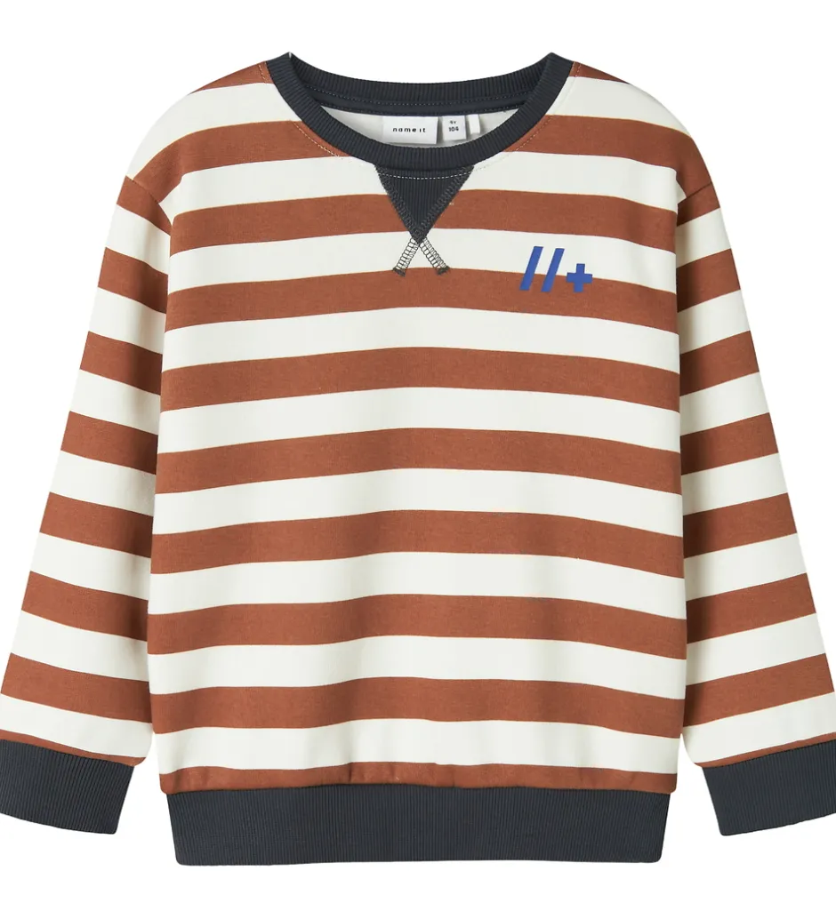 Smart Name It sweatshirt med vandrette striber i brun og hvid med mørkegrå ribkanter. Sweatshirten har et print på venstre bryst med tegnene “//+” i blå. Den har en rund halsudskæring og lange ærmer med ribaknter. Indvendigt er der blødt, børstet bomuld.