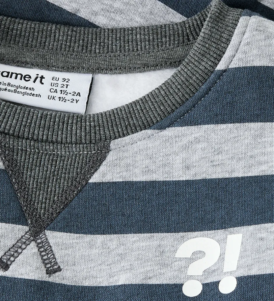 Stilfuld Name It sweatshirt med vandrette striber i gråmeleret og koksgrå. Sweatshirten har et print på venstre bryst med tegnene “?!” i hvid. Den har en rund halsudskæring og lange ærmer med ribaknter. Indvendigt er der blødt, børstet bomuld.