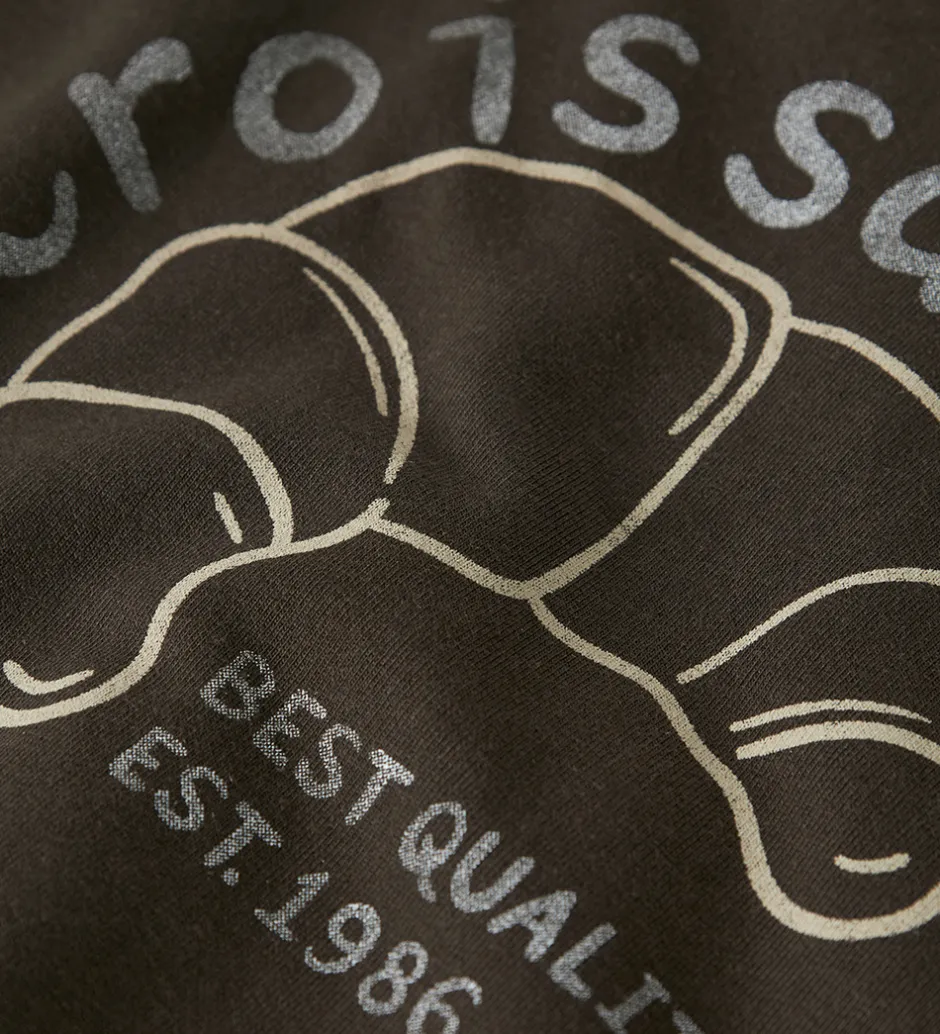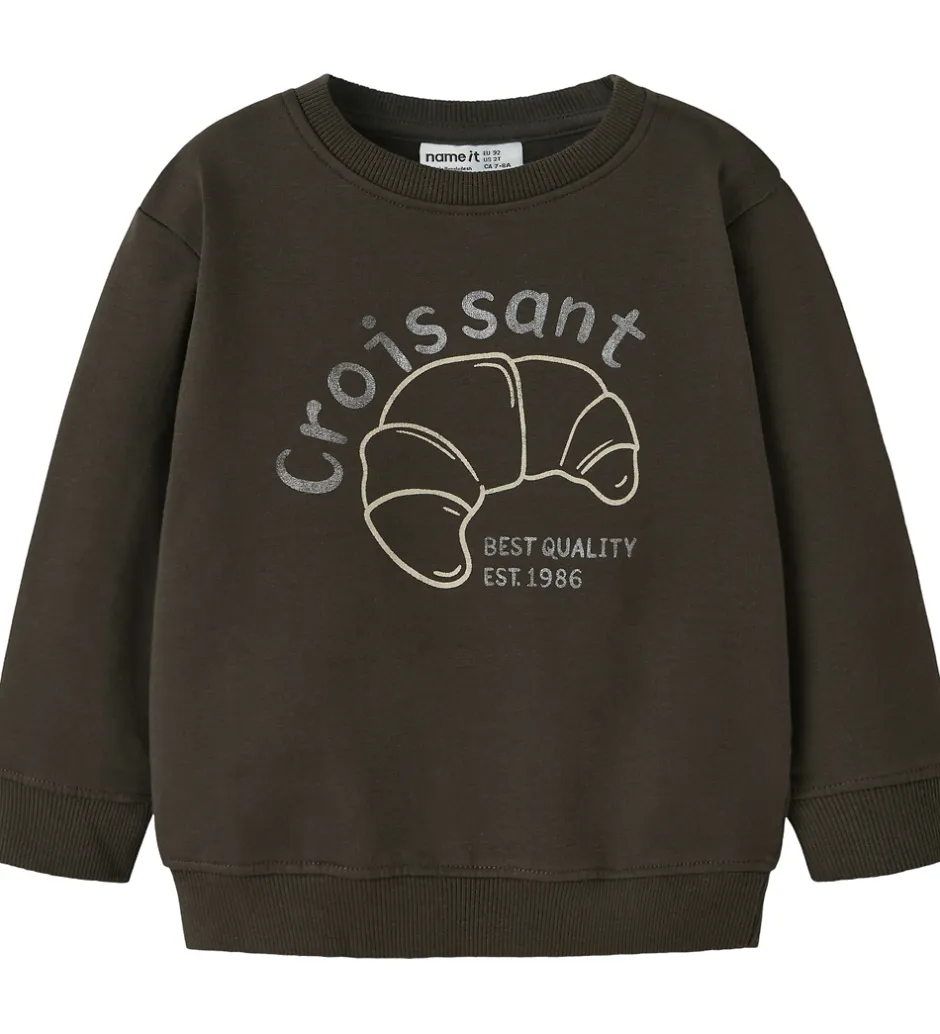 Flot Name It sweatshirt i mørkebrun med print af en crossaint og teksten “Croissant Best Quality Est. 1986” på fronten. I nakken er der broderet en beige crossaint. Name It sweatshirten har en rund halsudskæring og lange ærmer med ribkanter. Indvendigt er der blødt, børstet bomuld.