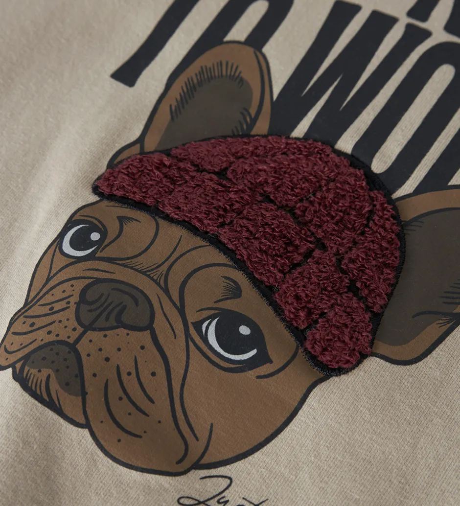 Charmerende Name It sweatshirt i beige med et humoristisk print af en hund iført en hue i rødt frotté og teksten “No Need To Worry”. Name It sweatshirten har en rund halsudskæring og lange ærmer med ribkanter. Indvendigt er der blødt, børstet bomuld.