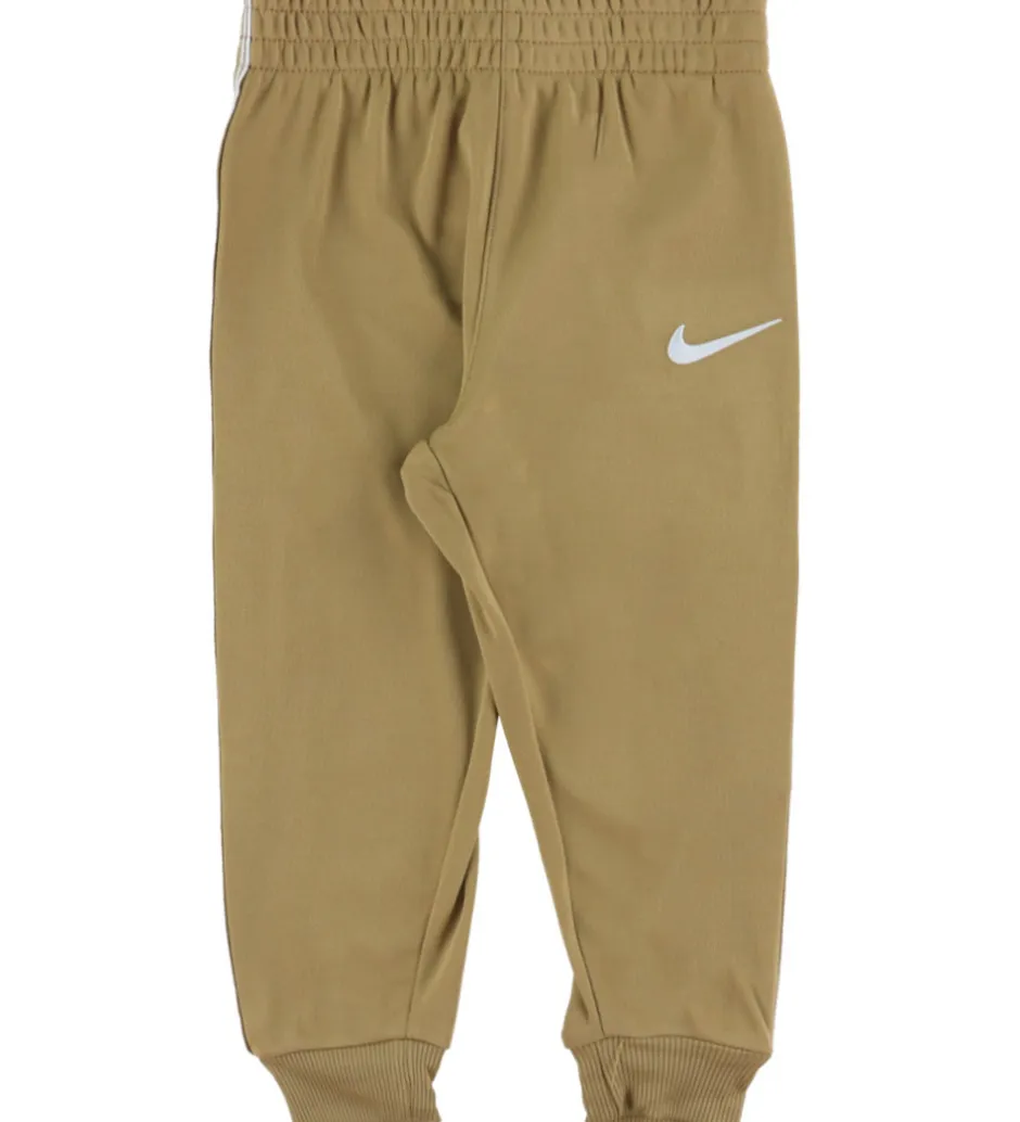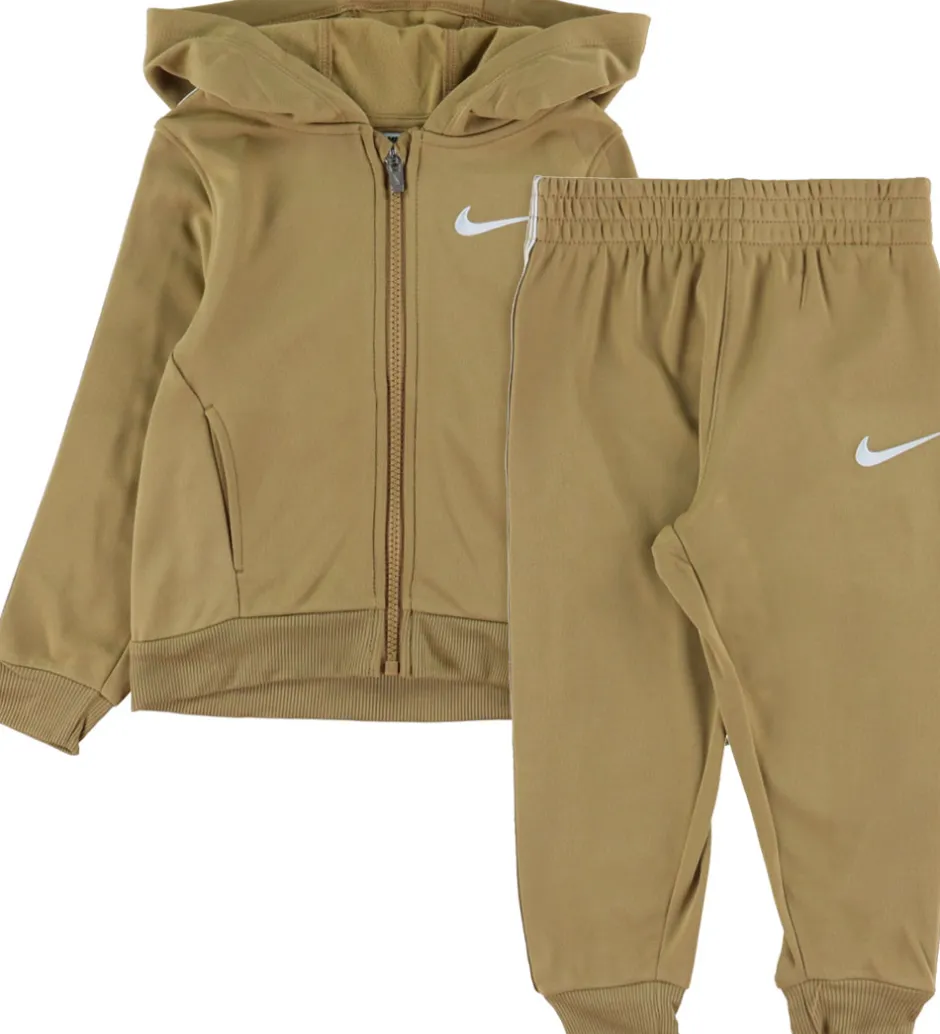 Flot Nike træningssæt, der består af en cardigan og et par bukser i beige, og ned ad ærmerne og benene er der logostriber i beige og hvid.