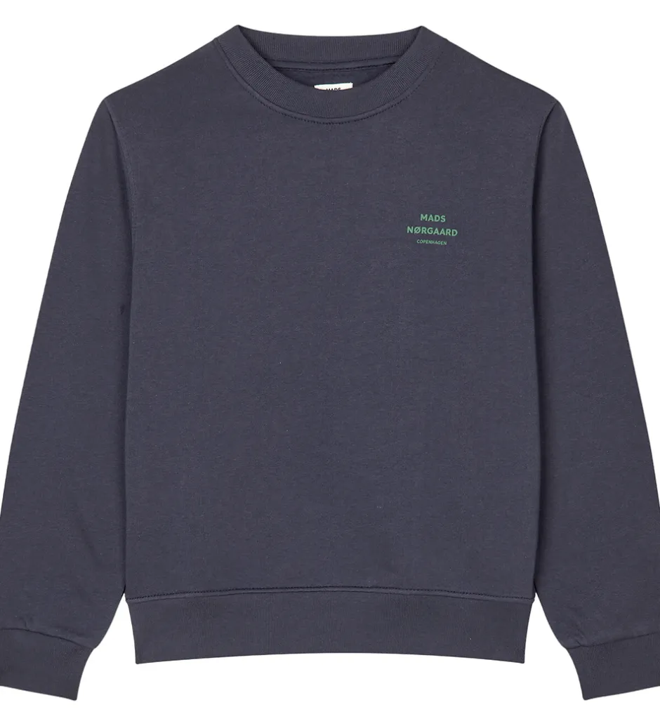 Flot Mads Nørgaard sweatshirt i navyblå med et lille grønt logo på venstre bryst. Sweatshirten har en rund halsudskæring med en smal ribkant og lange ærmer med brede ribkanter i ærme- og taljeåbning. Indvendigt er der blødt, børstet bomuld.