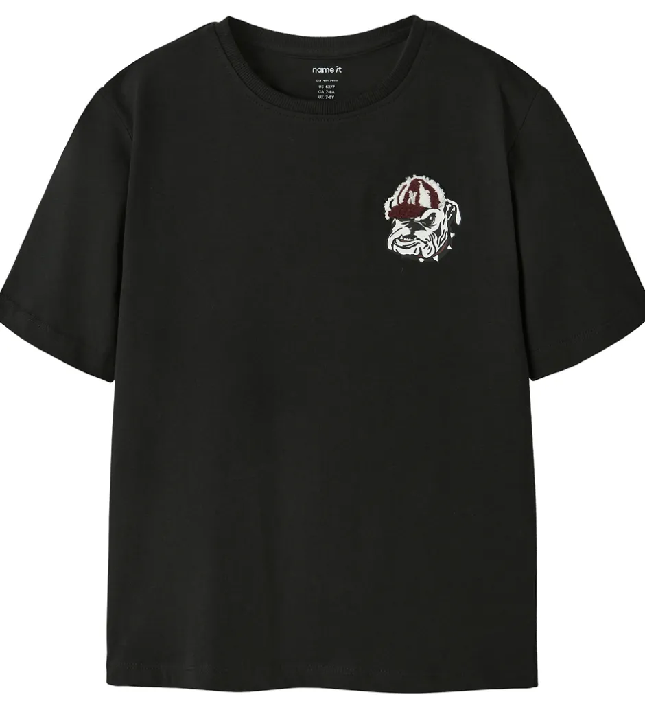 Sej Name It t-shirt i sort med et print på det ene bryst af en bulldog med en hat i frotté. Name It t-shirten er designet med en rund halsudskæring med en smal ribkant og korte ærmer.