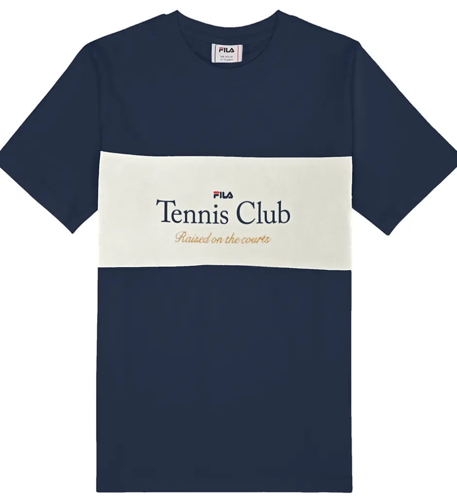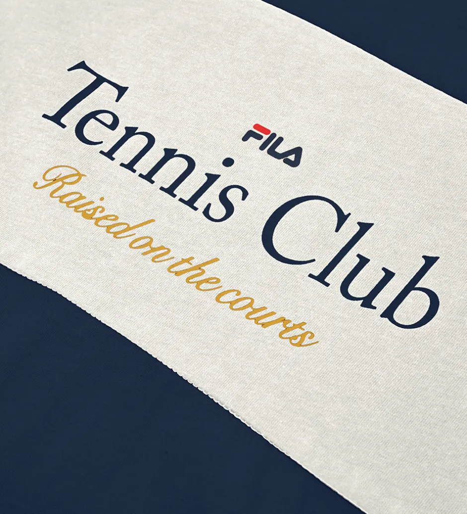 T-shirten er designet med en kontrasterende hvid stribe hen over brystet, der fremhæver teksten “Tennis Club” og “Raised on the courts” i elegante skrifttyper. Fila t-shirten har en klassisk rund halsudskæring og korte ærmer, der tilføjer et tidløst element til designet.