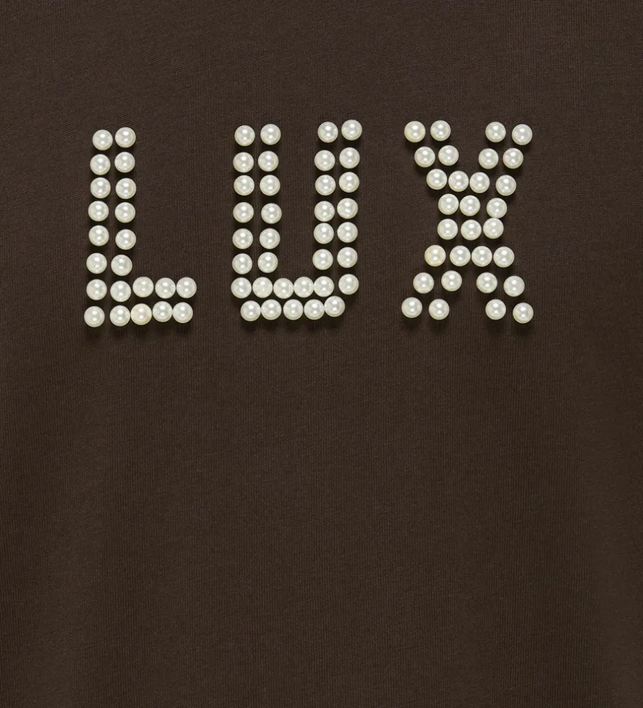Elegant Kids Only t-shirt i mørkebrun. T-shirten har små, hvide perler på fronten som danner ordet “LUX”. Kids Only t-shirten har en klassisk rund halsudskæring og korte ærmer, som giver et tidløst look.