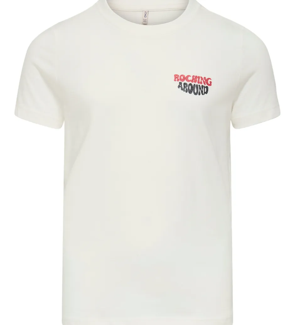 Elegant Kids Only t-shirt i hvid, med et stort juleprint på ryggen med glimmerdetaljer. T-shirten har et iøjnefaldende print på brystet med teksten “Rocking Around” i rød og sort, der giver et cool og moderne udtryk. Kids Only t-shirten har en rund halsudskæring med en smal ribkant og korte ærmer, som fuldender det stilrene look.
