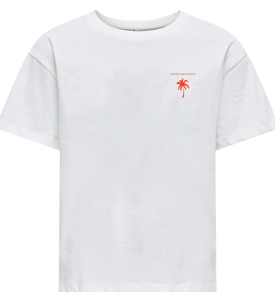 Smart Kids Only t-shirt i hvid med et rødt palmeprint på venstre bryst. På ryggen er der et stort print af et strandhus og palmer samt teksprint i blå og rød. T-shirten har en rund halsudskæring med en smal ribkant og korte ærmer.