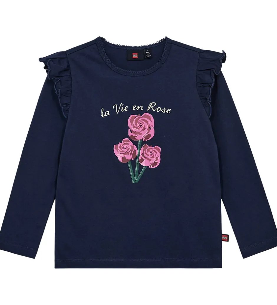 Charmerende LEGO® Wear bluse i mørkeblå med dekorative flæser ved skuldrene. Blusen har et smukt print fortil i form af pink LEGO®- roser samt teksten “la Vie en Rose” ovenover.