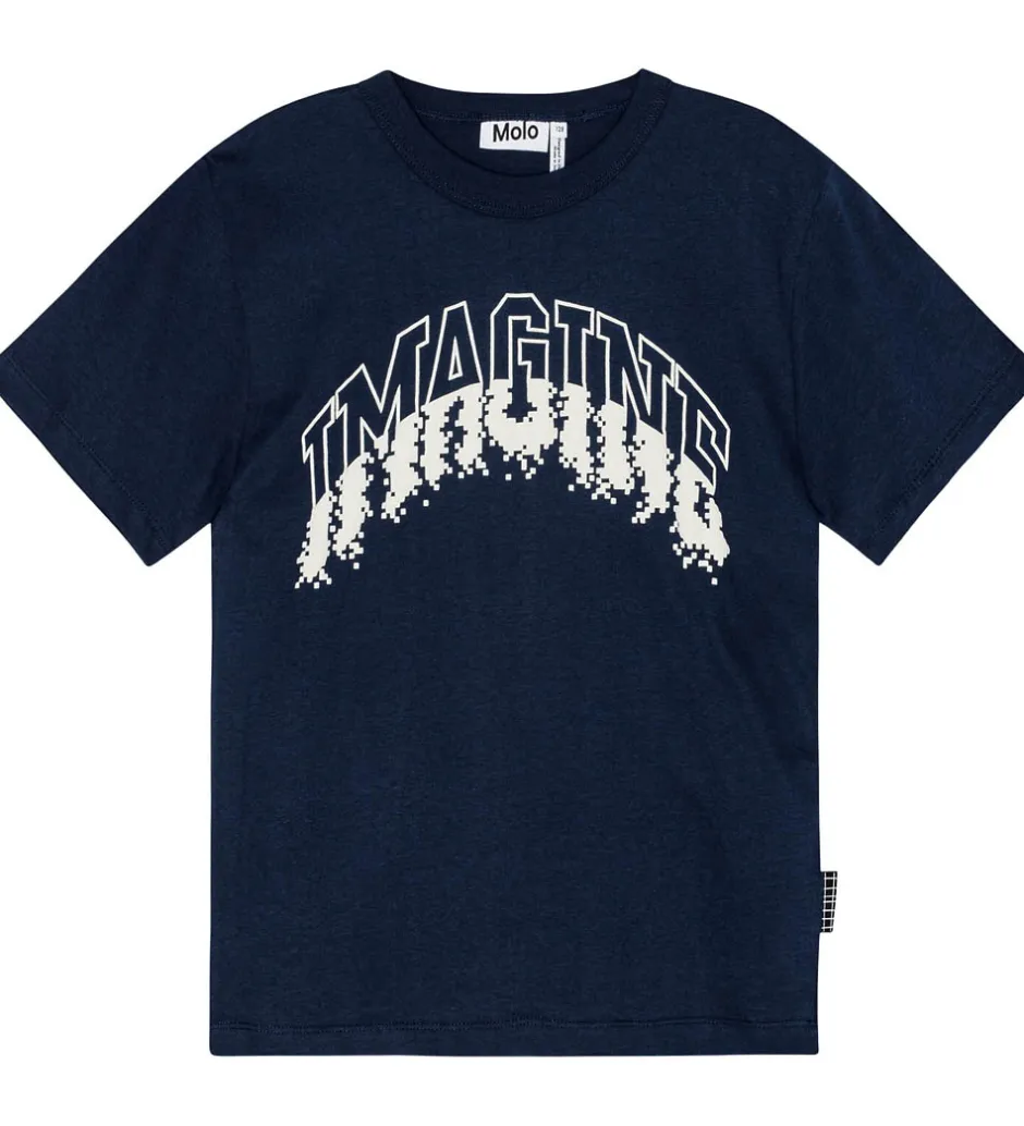 Stilfuld Molo t-shirt i en dyb marineblå nuance. T-shirten har et markant print med teksten “IMAGINE”, der er designet i store bogstaver øverst på forsiden. Under teksten ses en graduerende effekt, der skaber et moderne look. Molo t-shirten har en rund halsudskæring med en smal ribkant, der giver et enkelt udtryk.
