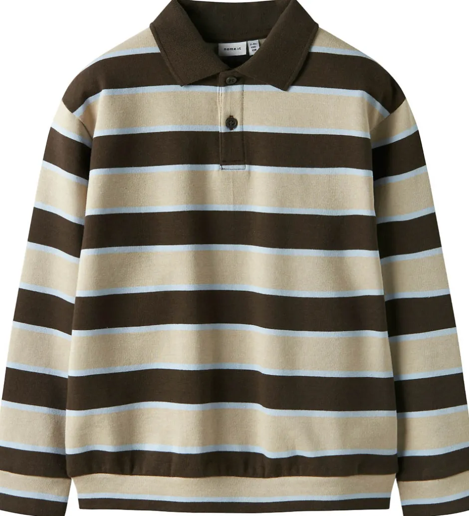 Poloblusen præsenterer et flot mønster af brede horisontale striber i brune, beige og lyseblå nuancer. Den har en praktisk knaplukning foran, som giver et tidløst look. Name It poloblusen fremstår med en blød struktur, der gør den behagelig at have på.
