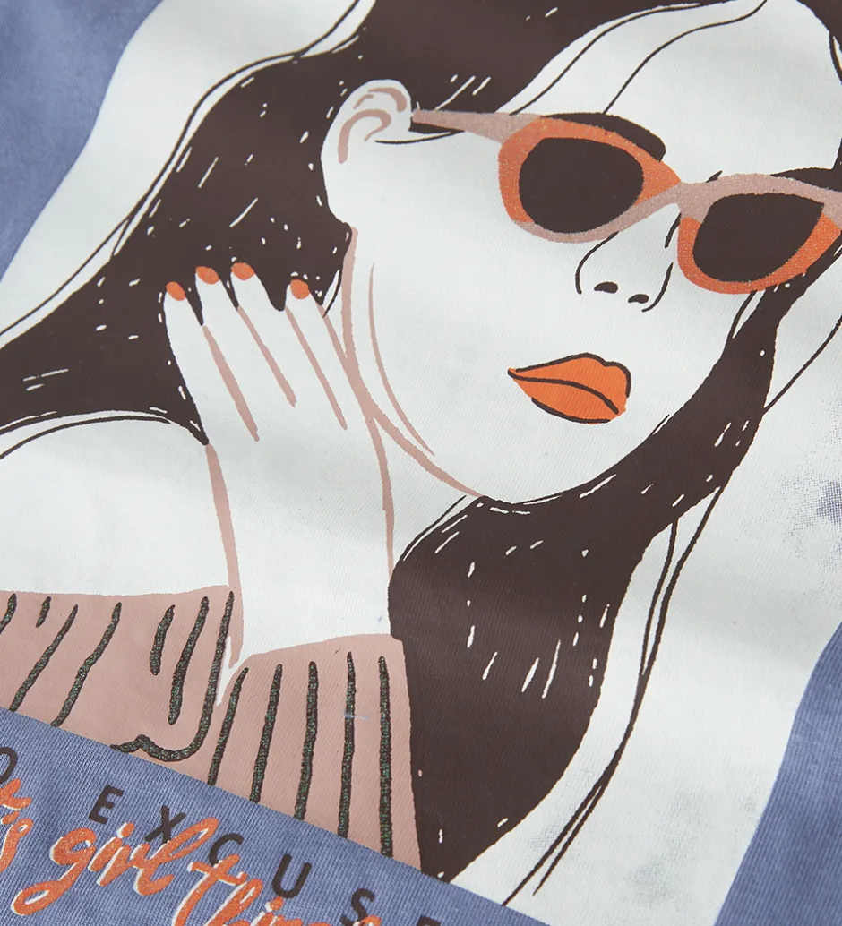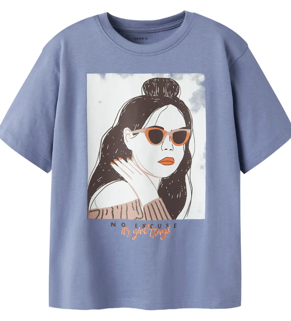Stilfuld Name It t-shirt i en støvet blå nuance. T-shirten har et iøjnefaldende print på fronten med en pige iført solbriller og teksten “No Excuse It’s Girl Things”. Name It t-shirten har en klassisk rund halsudskæring og korte ærmer, hvilket giver et moderne og afslappet look.