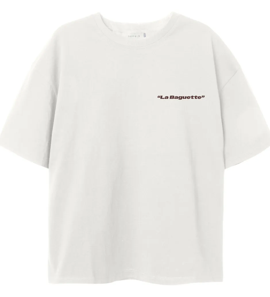 Flot Name It t-shirt i hvid med teksten “La Baguette” i mørkebrun på venstre bryst. På ryggen er der et stort gult print og tekstprint i mørkebrun. Name It t-shirten har en klassisk rund halsudskæring og korte ærmer.