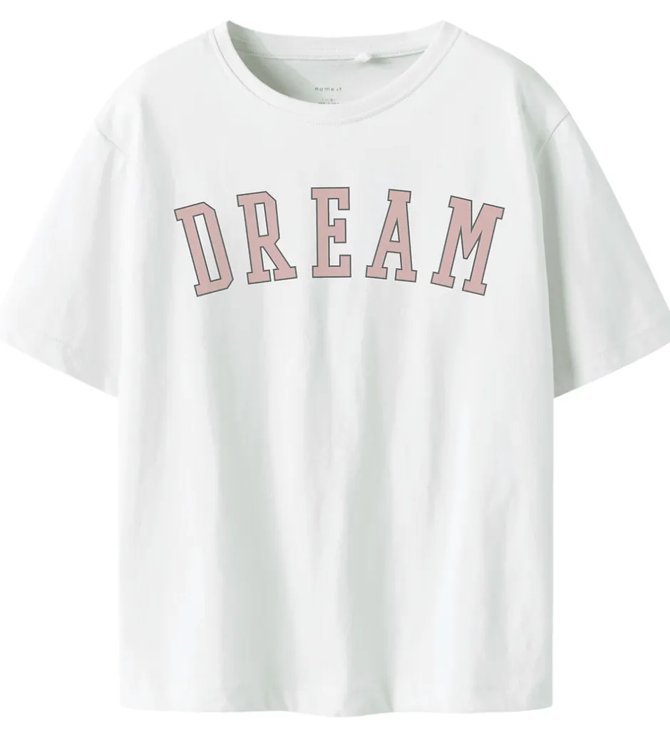 Fin Name It t-shirt i klassisk hvid med teksten “DREAM” i rosa, der giver et enkelt, men iøjnefaldende udtryk. Name It t-shirten har en rund halsudskæring med en diskret ribkant, hvilket giver et stilrent look.