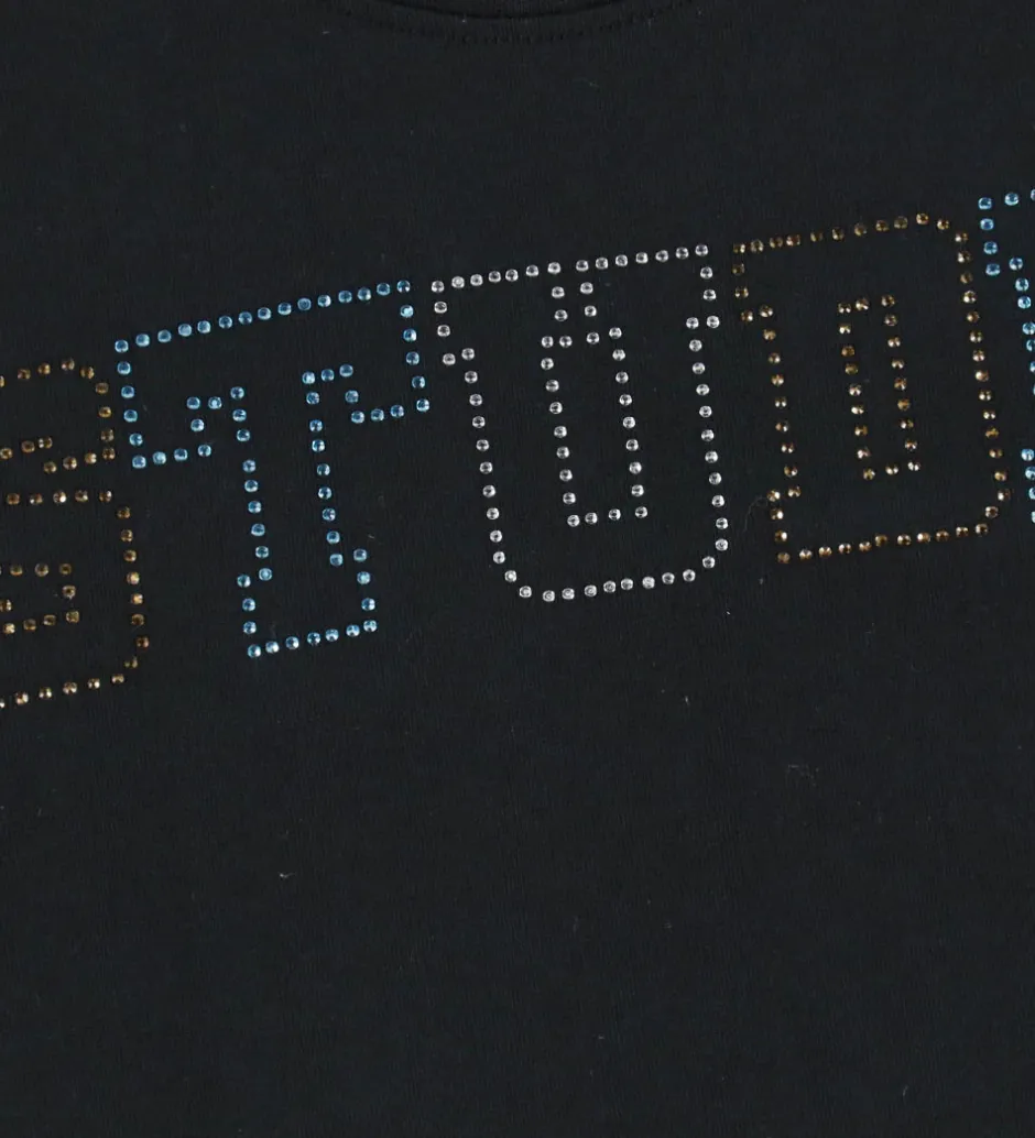 Flot Name It t-shirt i sort med små similisten på fronten i blå, hvid og brun som former ordet “Studio”. Name It t-shirten har en rund halsudskæring med en smal ribkant og lange ærmer.